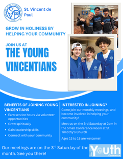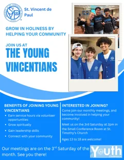 - If you’re between the ages of 13-18, join the Young Vincentians at their meetings on the 3rd Saturday of the month at 2 p.m. in the Parish conference room. Find opportunities to gain service hours